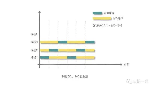 上面已经让大家按照图多画几个周期(你可以动手将I/O耗时与CPU耗时比例调大,比如6倍或7倍),这样你就会得到一个结论,对于 I/O 密集型程序: