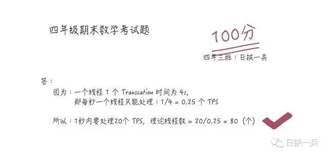 假设要求一个系统的 TPS(Transaction Per Second 或者 Task Per Second)至少为20,然后假设每个Transaction由一个线程完成,继续假设平均每个线程处理一个Transaction的时间为4s