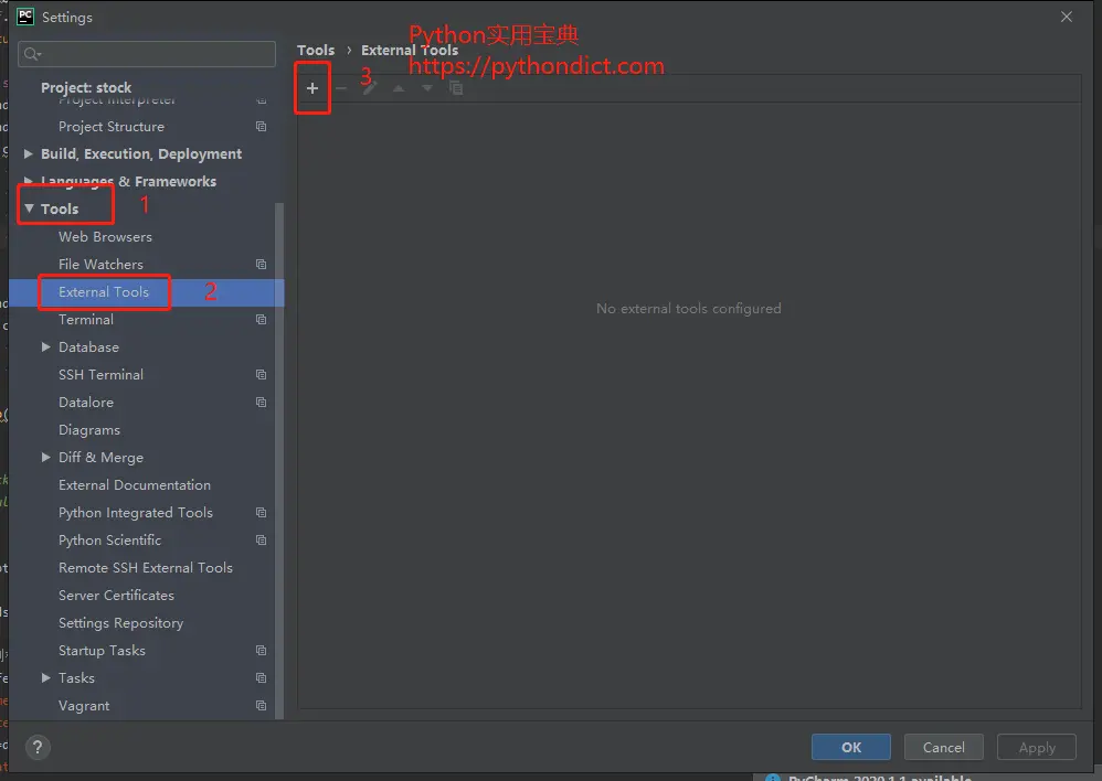 在PyCharm菜单 File->Setting->Tools->External Tools->单击按钮“+”号: