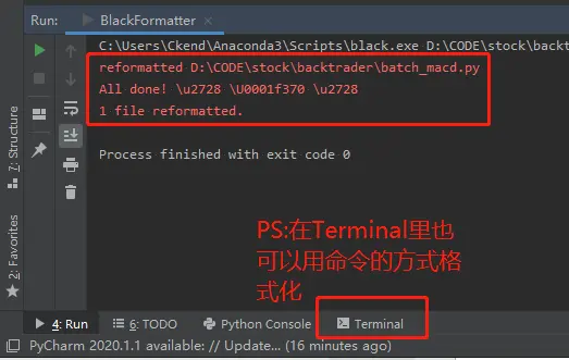 当然,Pycharm也可以使用命令的方式格式化,在Terminal里输入即可,因为它其实和Vscode的终端是一个东西,注意black安装的环境和你终端使用的虚拟环境是一致的就行。