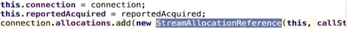 this.connection)。 - 把StreamAllocation的弱引用添加到RealConnection的allocations(ArrayList)集合中,通过这个集合判断StreamAllocation的个数,进而判断一个网络连接的负载量是否已经超过OkHttp指定的最大值(最大连接数)。