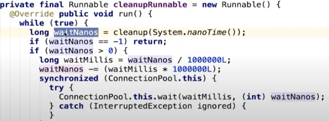 ConnectionPool.this.wait等待释放锁和时间片,等待时间过后会再次调用cleanupRunnable去清理(while(true)),同时返回下次要清理的时间waitNanos。
