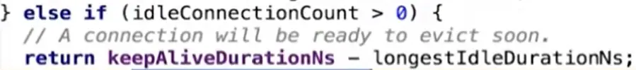 idleConnectionCount > 0),则keepAliveDurationNs - longestIdleDurationNs时间后再次清理。 - 若有正在使用的连接(