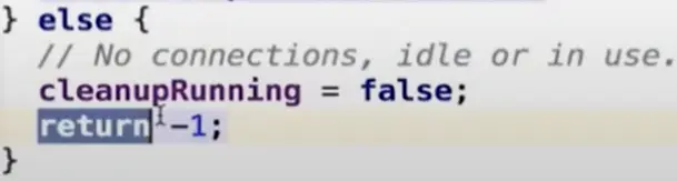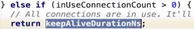 inUseConnectionCount > 0),则返回keepAliveDurationNs时间供下次清理使用。 - 没有任何连接时返回-1,跳出
