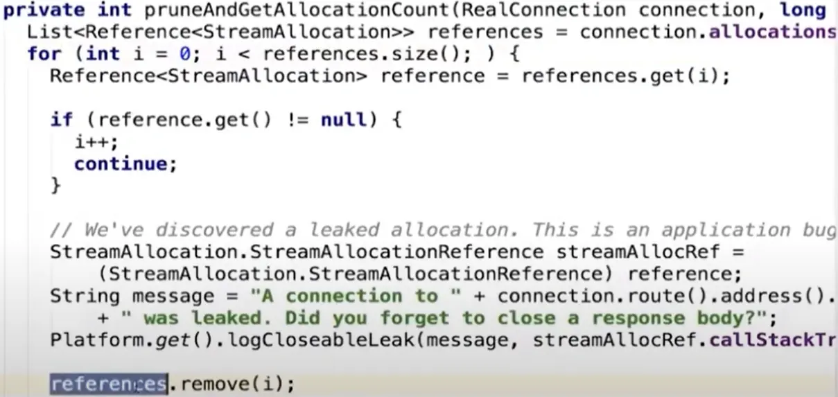 Ans:pruneAndGetAllocationCount方法遍历弱引用集合,根据弱引用是否为null,为null表示没有代码引用该对象,则删除它(references.remove(i))。