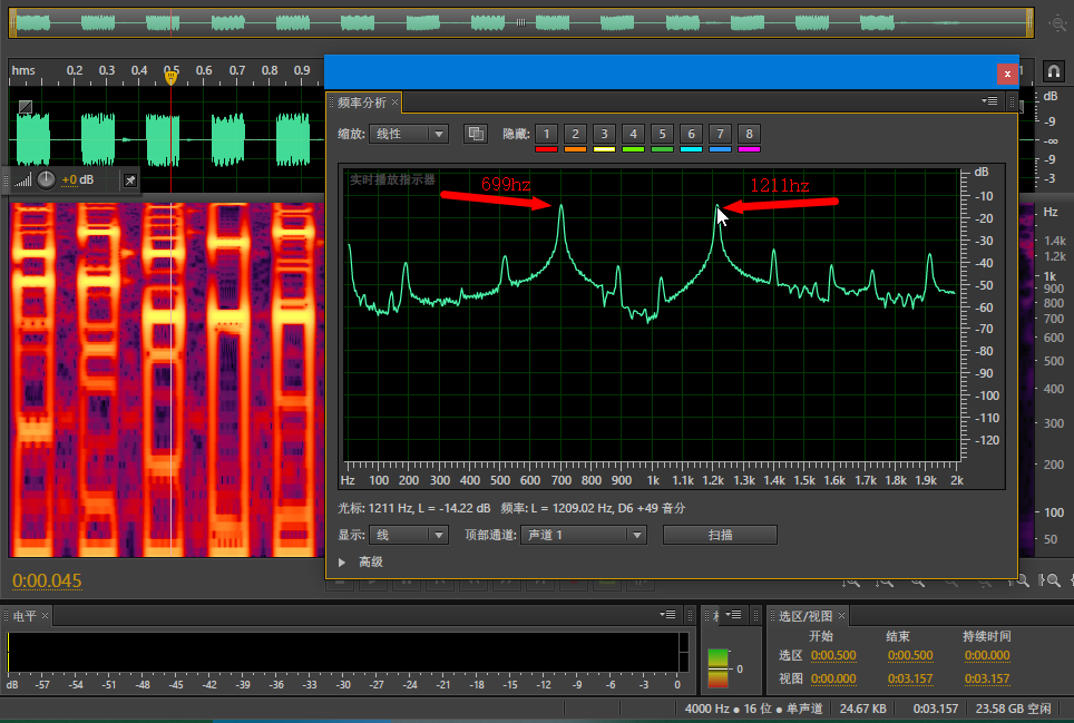 观察上面【图1】,一个长的PCM音频中,每个按键信号频谱中都能清晰的看到两条非常亮的横线(对应此频率的信号能量非常强),Adobe Audition中定位到需要分析的时间位置,然后点击菜单:窗口->频率分析(Alt+Z),显示频率信息得到两个最高的频率;这两个最高频率就是上面频率对照表中的频率值(取最接近的值):低频703hz约等于697,高频1203hz约等于1209,查表可知此信号对应的按键为“1”。