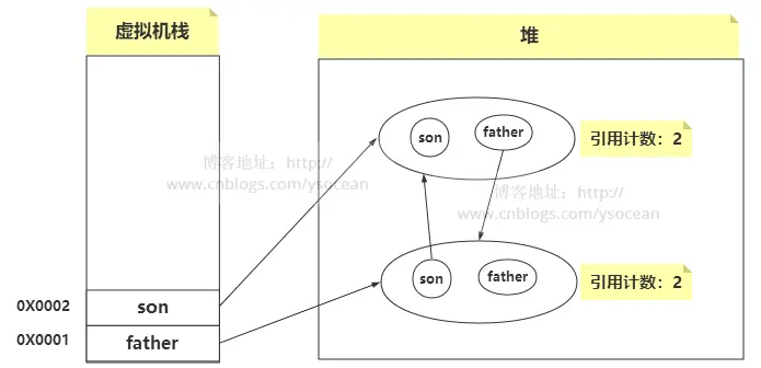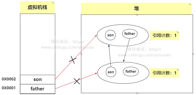 这种算法实现简单,而且效率也很高。但是Java没有采用该算法来进行垃圾回收,因为这种算法无法解决对象之间的循环引用问题。
