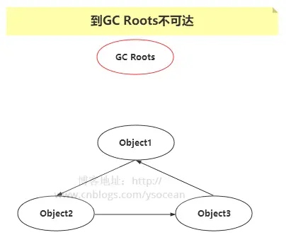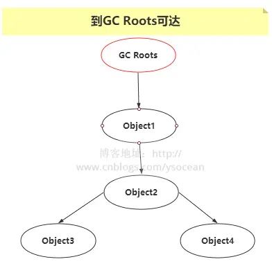该算法思路:通过一系列名为“GC Roots” 的对象作为终点,当一个对象到GC Roots 之间无法通过引用到达时,那么该对象便可以进行回收了。