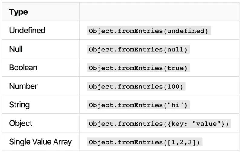 将下面的类型传入 Object.fromEntries 都会导致报错 caught TypeError。