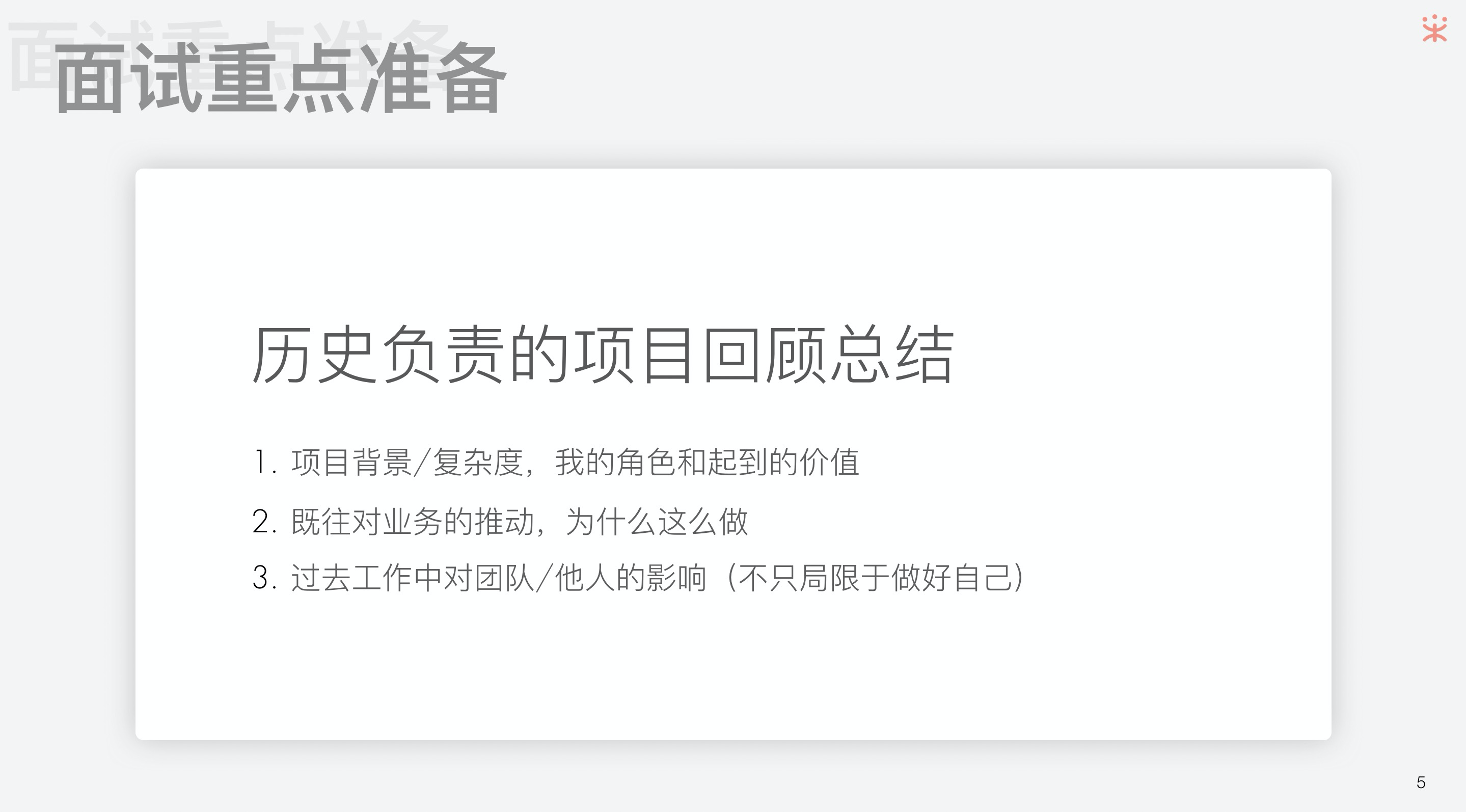 比较多的公司在面试时会先让面试者做一下项目介绍,然后通过项目展开提问,我当时准备的主要从以下 3 点来阐述我的历史项目,分别是项目背景/我的角色和起到的价值,既往对业务的推动,以及过去工作中对团队或者他人的影响。