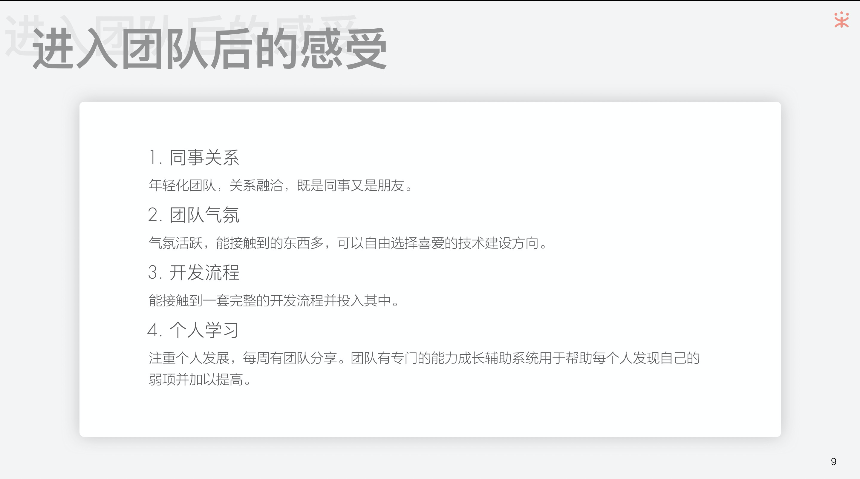 一般在别的团队,比如一些大型公司,没法接触到一套完整的开发流程,但在这却可以一起参与进去,说实话能学到的东西还是比较多。团队也有非常多的分享,每周会有同学进行技术或业务分享,大家也会积极参与讨论。