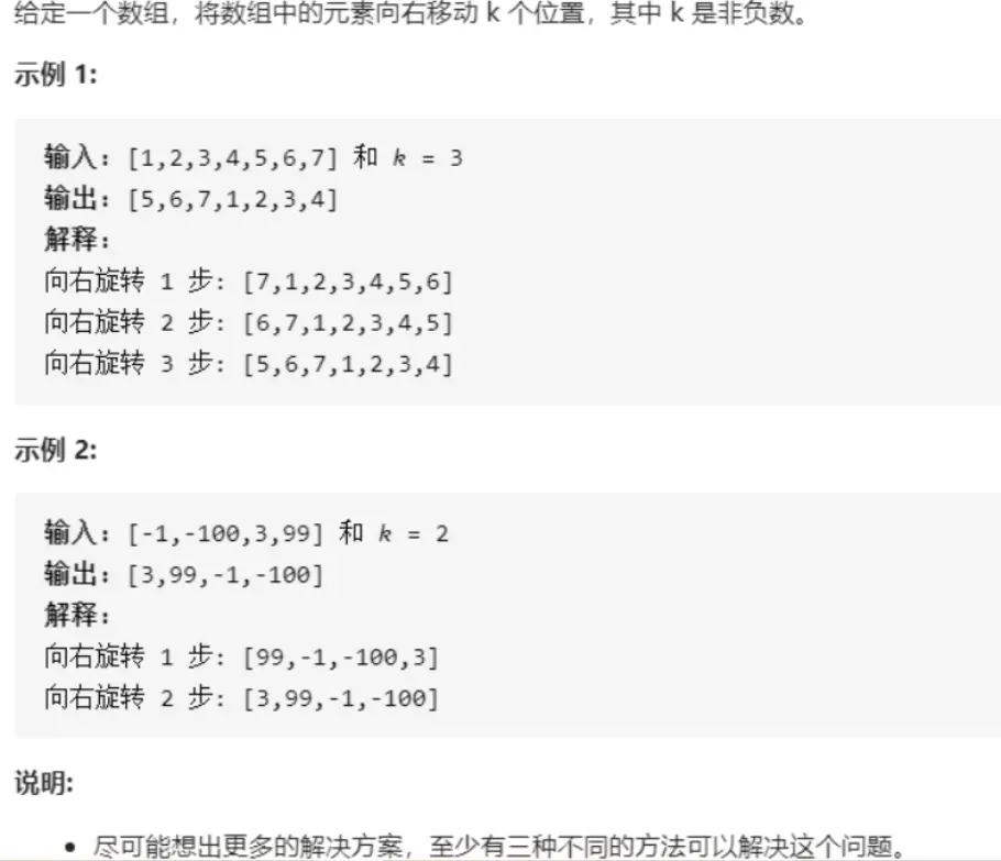 我们可以用一个额外的数组来将每个元素放到正确的位置上,也就是原本数组里下标为 i 的我们把它放到 (i+k)%数组长度的位置。然后把新的数组拷贝到原数组中。