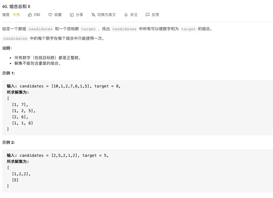 你一看题目是不是就发现,差不多啊,确实,这里只是每个数字只能用一次,同时也是不能包含重复的组合,所以,用上面的去重方法解决咯。话不多说,上代码。