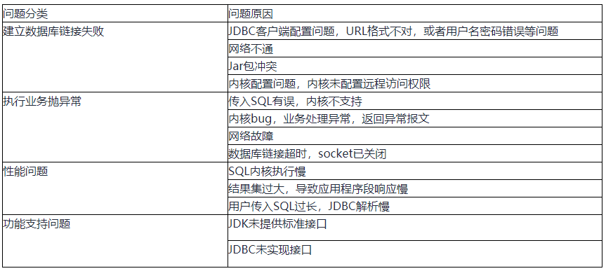 JDBC问题是指比较宽泛的,体现在JDBC层面的问题,造成JDBC问题的原因主要是三个方面:1、应用程序和应用程序框架问题;2、JDBC业务功能问题;3、数据库内核问题。问题表现可以分为三个大的方面:1、执行报错,JDBC抛出异常;2、执行效率低,耗时异常;3、特性不支持,JDBC未实现的JDK接口。