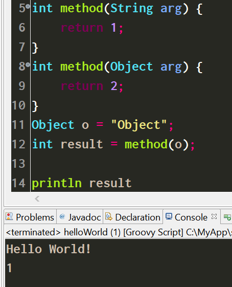 In Groovy, the methods which will be invoked are chosen at runtime. This is called runtime dispatch or multi-methods. It means that the method will be chosen based on the types of the arguments at runtime. In Java, this is the opposite: methods are chosen at compile time, based on the declared types.