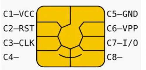 SIM卡在与手机连接时,最少需要5个连接线:电源(VCC) 、复位(RST)、时钟(CLK)、接地端(GND)、数据I/O口(I/O)。