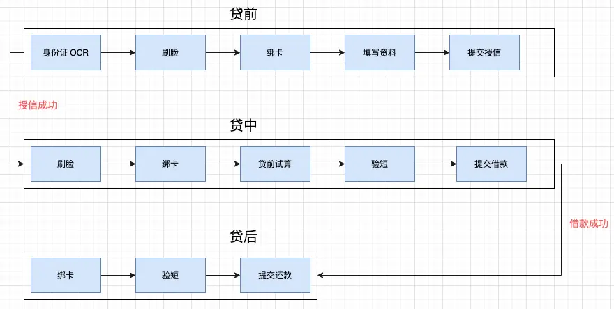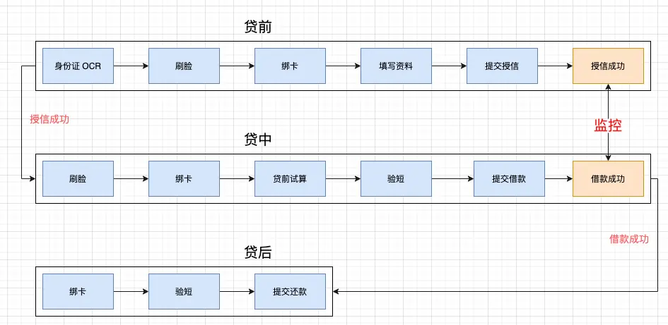 - 贷中:即借款环节,授信通过之后,用户就可以借款了