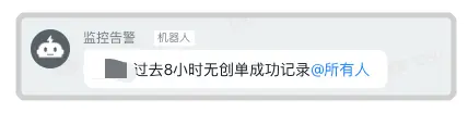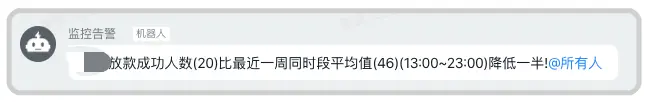 当然上文也说了,每个资金方授信成功或借款成功的总数很可能在几十分钟内都为 0,那我们可以以小时的成功总数来告警。 我们记录下每天每小时的成功总数,每半小时比较今天和过去一周同一时间段(平均值)近 X 小时内的成功数,如果低于过去一周平均成功数的一半,说明可能链接出问题了,就告警,这个 X 怎么选择呢,如果最近一小时成功总数小于 20(这个阈值需要根据实际情况选取),那我们就选今天和过去一周同一时间段最近两小时的成功总数进行比较,如果还是小于 20 ,那就选最近三小时的成功总数进行比较。。。,直到最近 X 小时的成功总数达到 20,这样误差就比较小了,通过这种方式的告警有效率目前为止 100%! 也发现了线上多起问题,钉钉告警展示如下: