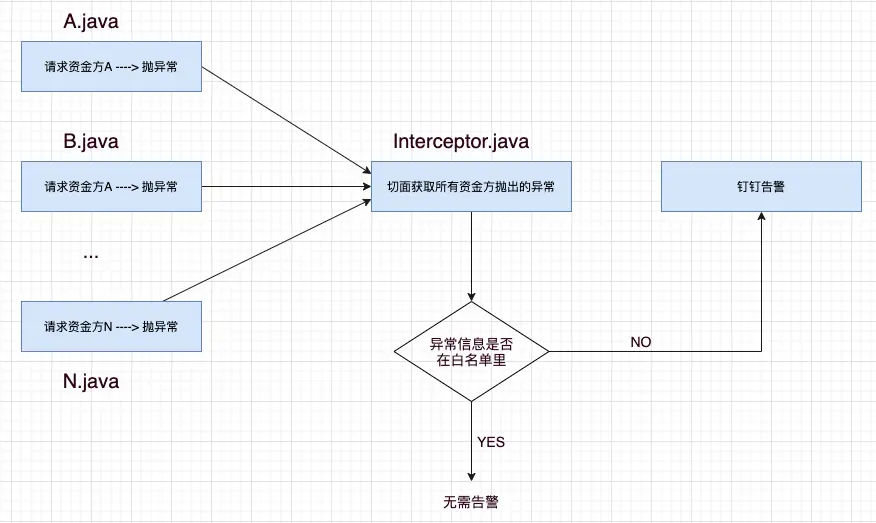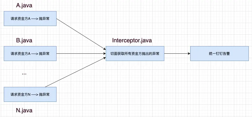 很显然如果能用切面拦截所有这些资金方抛出的异常,那我们就能把针对这些异常的告警统一写在切面里,不会对现有代码有任何入侵,且方便统一管理所有资金方的告警,也就完美解决了问题一。