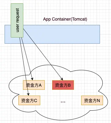 如图示:某次用户请求要请求多个资金方,如果资金方 B 的接口服务挂了,很可能导致此次用户请求也挂!甚至导致整个业务不可用!