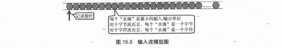 1. 对于InputStream和Reader而言,它们把输入设备抽象成为一个”水管“,这个水管的每个“水滴”依次排列,如图15.5所示: 2. 从图15.5可以看出,字节流和字符流的处理方式其实很相似,只是它们处理的输入/输出单位不同而已。输入流使用隐式的记录指针来表示当前正准备从哪个“水滴”开始读取,每当程序从InputStream或者Reader里面取出一个或者多个“水滴”后,记录指针自定向后移动;除此之外,InputStream和Reader里面都提供了一些方法来控制记录指针的移动。