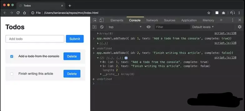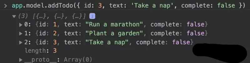 app.model.addTodo({ id: 3, text: 'Take a nap', complete: false })将向列表中添加一个待办事项,你可以查看 app.model.todos 的内容。