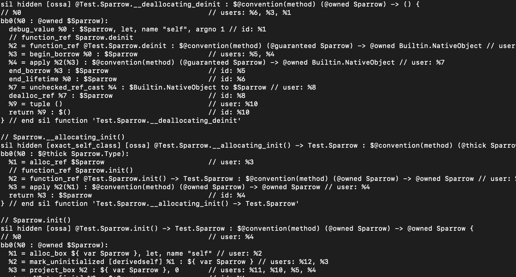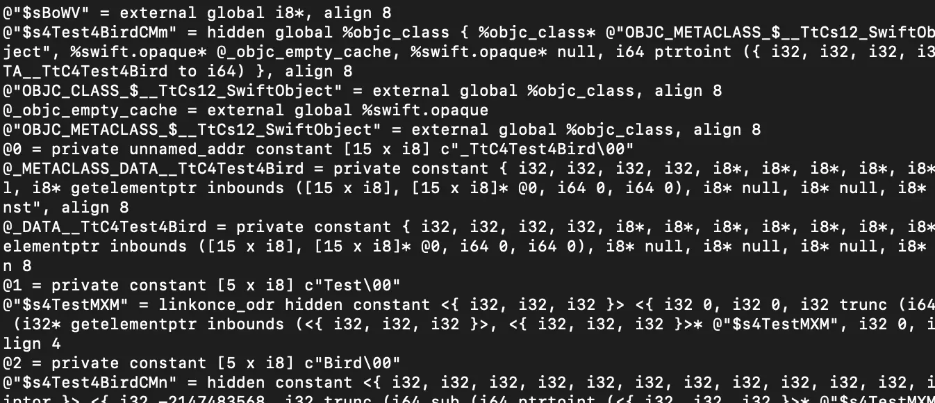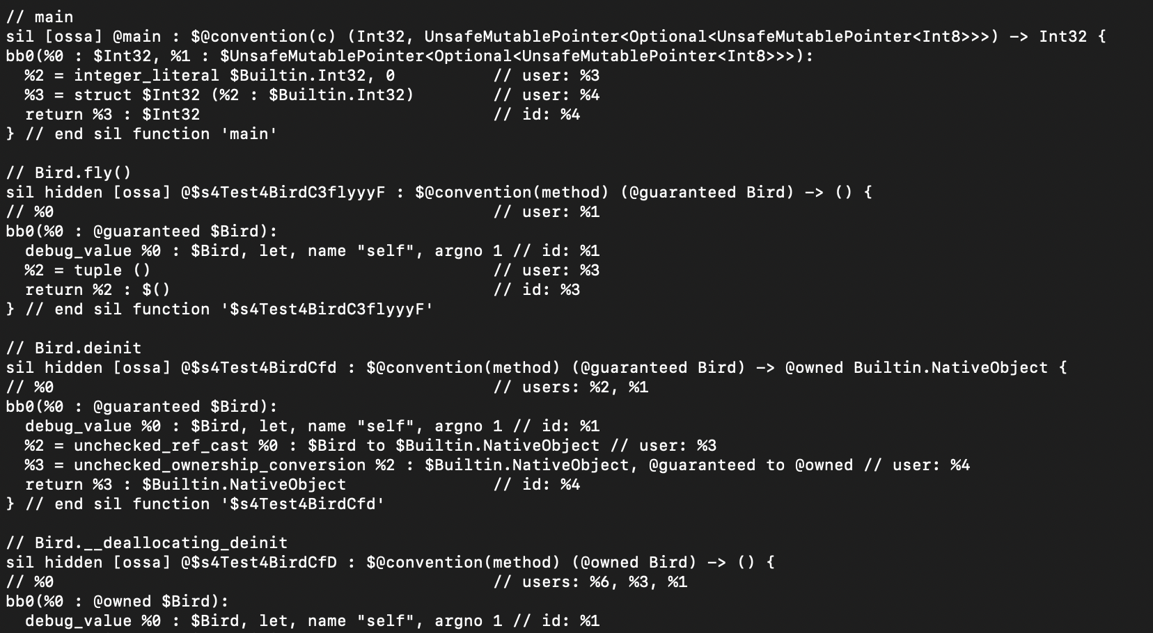 看到这些终端输出的SIL生成内容,你可能会发出这样的惊讶:"OMG😮。@$s4Test4BirdC3flyyyF是个什么鬼东西?"。别担心,这没你想的那么可怕,它只是一种名称混淆,用于将实体的附加信息压缩到单个字符中。这个处理过的名称包含了一些类型(class/struct/enum)、module、上下文等信息。例如,在@$s4Test4BirdC3flyyyF中,Bird后面的字母C表示Bird是一个class。它还可以表达很多东西,但这不是本文的重点。如果你对它有兴趣,可以在反馈部分添加评论。此外我们可以使用swift-demangle追溯一个混淆的字符串直到它最初可读的文本样式。