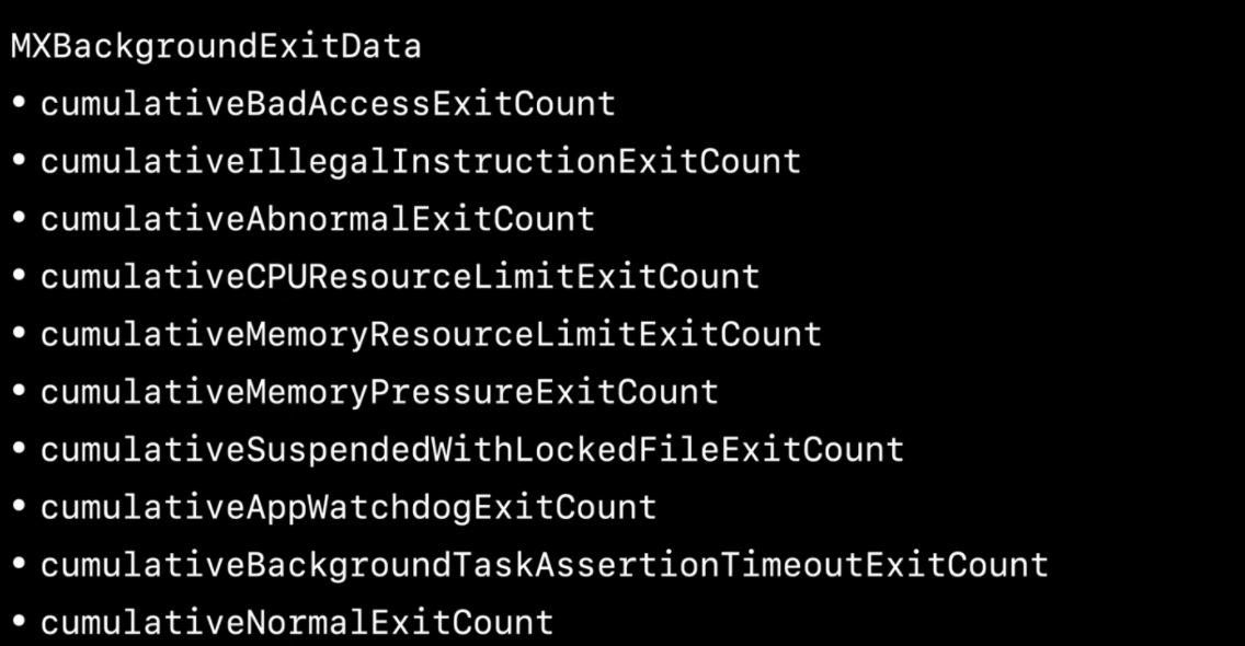 MXBackgroundExitData通过提供每次应用程序被终止时的退出计数,了解为什么应用程序会被杀死。