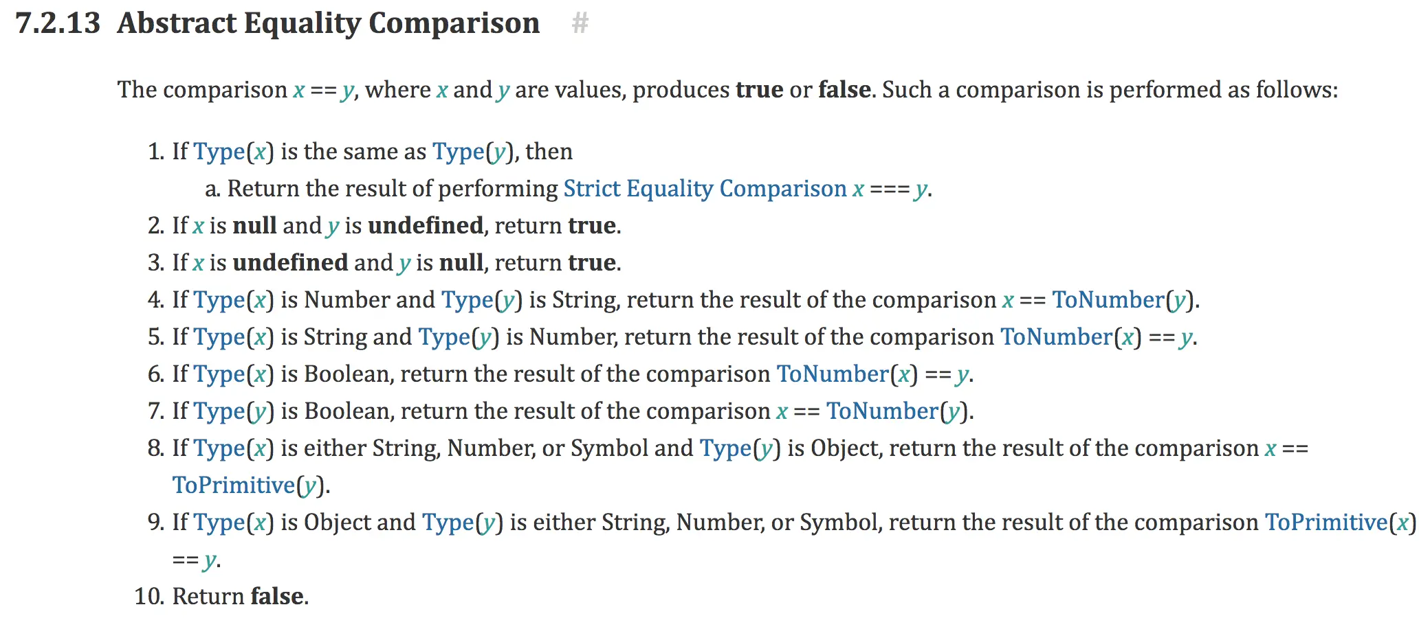 总结:如果相等操作符两边的操作数,不包含 null 或者 undefined,且两个操作数不全是对象,在执行相等比较之前,会先调用 Number() 将两个操作数强制转为 Number 类型,然后进行比较