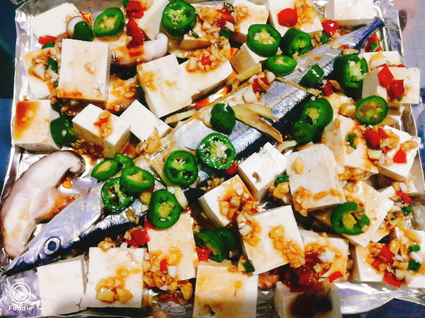 在叮咚买菜上买了秋刀鱼,但是回来要把鱼杀了,去除内脏,给他来套马杀鸡,充分按摩他,把盐给揉进去。然后切好豆腐,弄好调料(色拉油,酱油,剁椒,十三香,冰糖,白胡椒粉,蚝油,蒜泥,姜丝,线圈,就这些啦)淋上去。