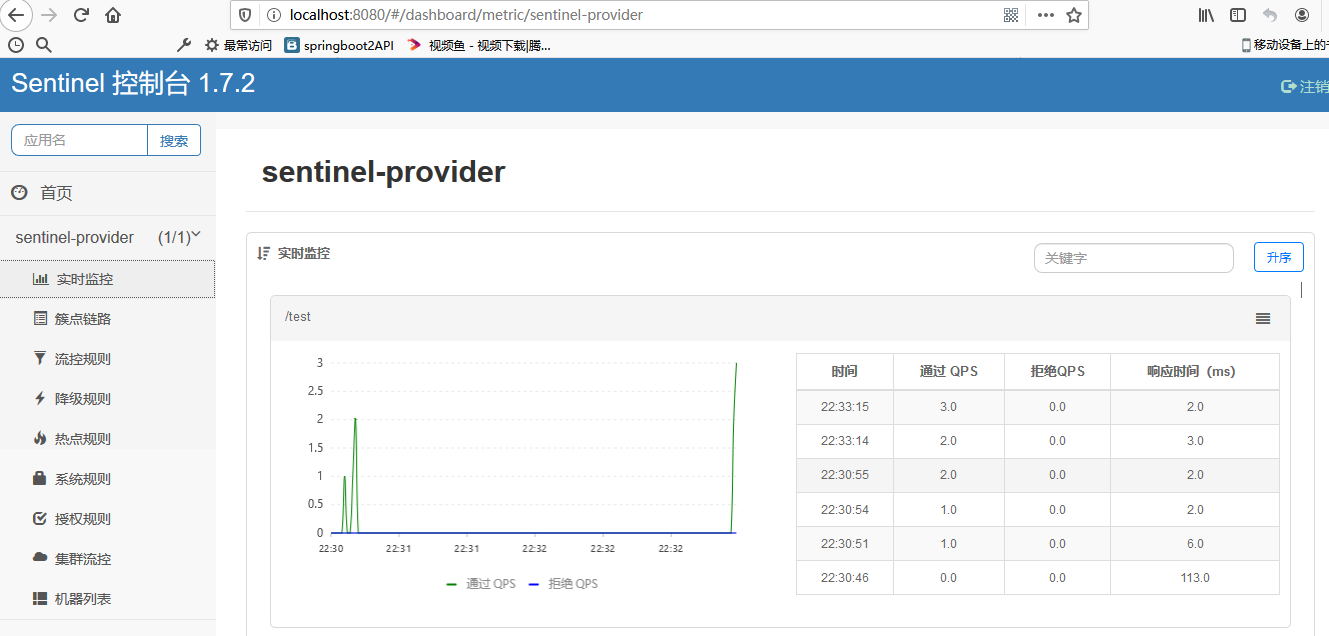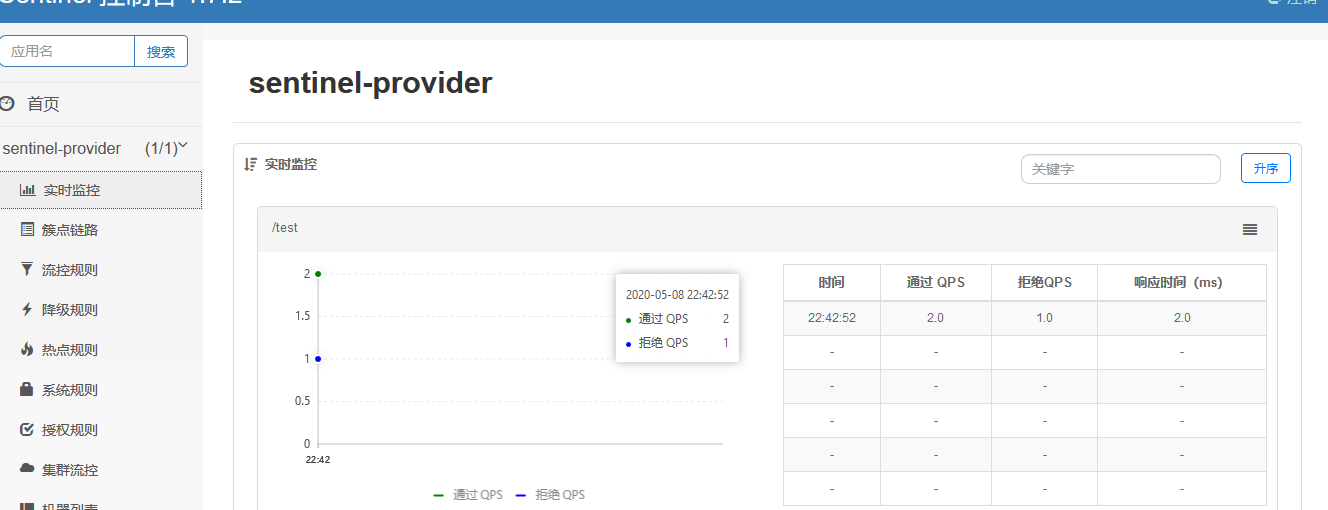 我们请求几次这个接口后,打开sentinel控制台,就可以实时监控到这个sentinel-provider服务接口调用情况了。