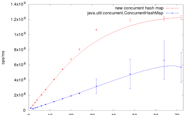 新算法的 map 大小与ConcurrentHashMap 类似。500万随机key, java.util.concurrent.ConcurrentHashMap 需要285M字节,新 map 需要253M字节。