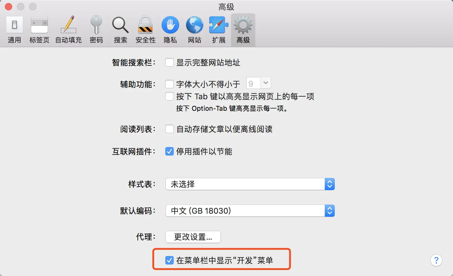 2)打开 mac 上 sarifi 的开发者模式 操作:打开 sarifi 浏览器 - 左上角的sarifi浏览器 - 偏好设置 - 高级,勾选底部的在菜单栏中显示“开发”菜单