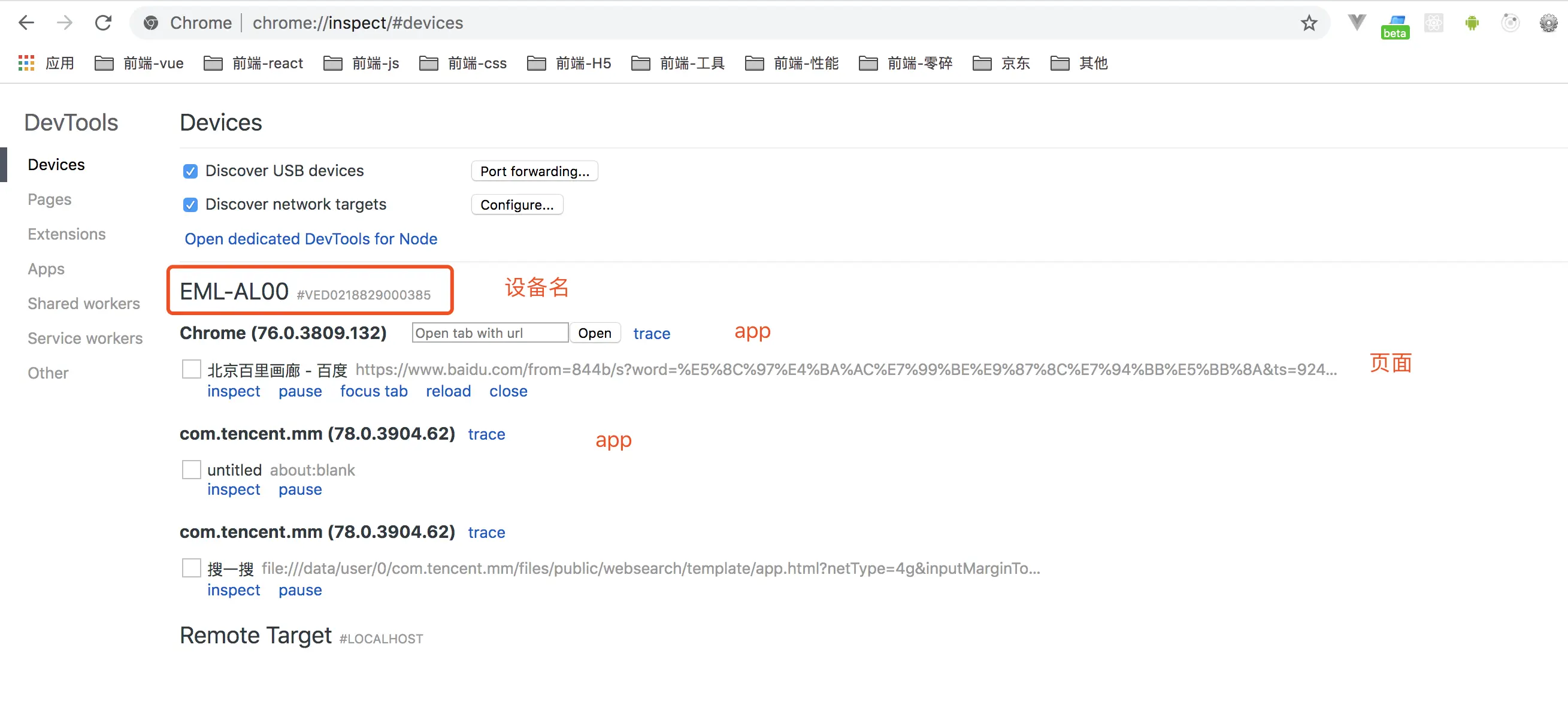 app 分为 debug 包和 release 包,只有 debug 包才可以调试页面,而平时从应用商店下载的包都是 release 包。因此,要调试app上的web页面,需要你的 Android手机 上装有该 app 的 debug 包才可以。