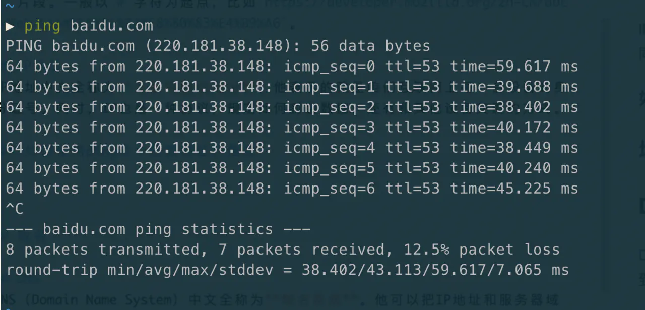 在命令行中使用ping,可以用来测试网路是否连通。如下图所示,在网络正常的情况下,会不断的请求baidu.com这个网址。