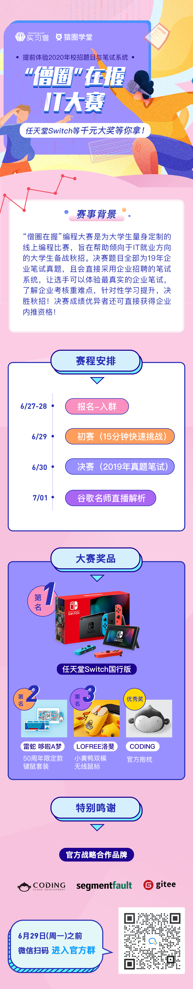 “僧圈”在握 IT 大赛,千元大奖、内推资格等你拿! CODING 2020-06-28 149 阅读1分钟 2020 年秋招在即,许多预备程序员即将踏入工作岗位,但是苦于没有应聘求职的经验,十分害怕在秋招中踩坑。在众多应聘者中,青涩的你如何才能脱颖而出呢? 所以今天,CODING 给大家来送福利了——我们联合猿圈学堂,为想要就业 IT 岗位的小伙伴提供一次真实的企业秋招模拟笔试,模拟笔试是以比赛的形式进行,我们为大家准备了超多奖品,表现优异者还可以得到企业内推资格!心动的话就赶快行动吧~ 详细信息和报名方式请看下方海报↓↓↓