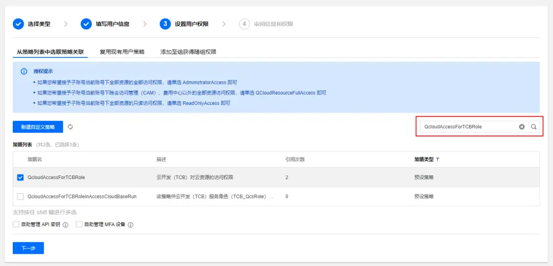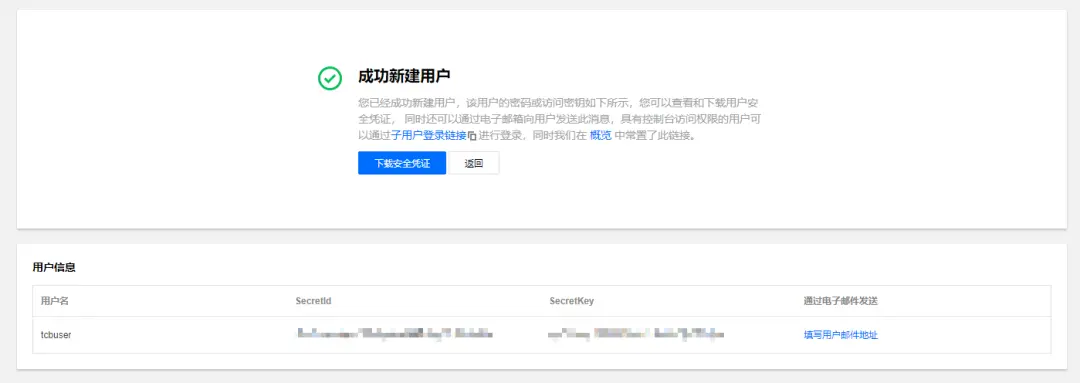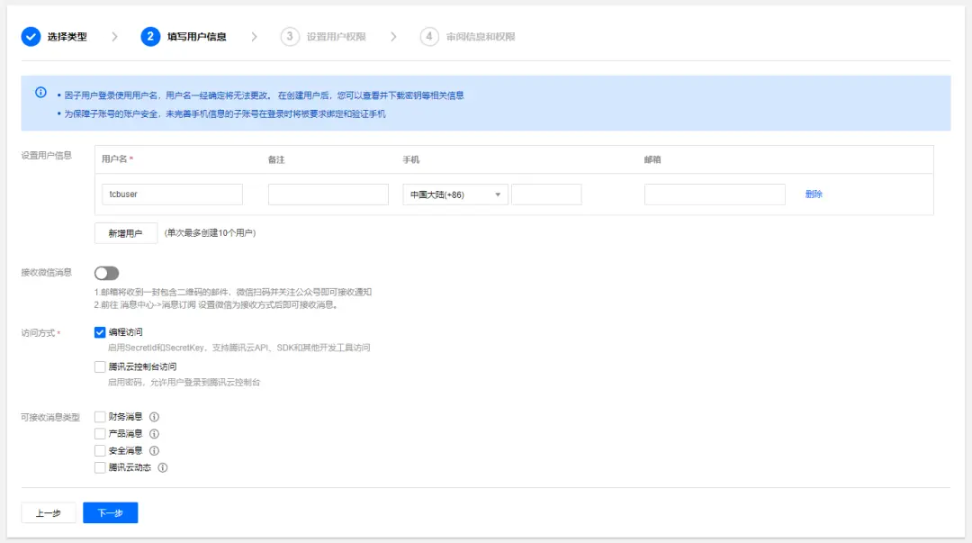 在流水线中,一般不会使用特权账号的 SecretKey(主账号的最高权限 SecretKey,拥有腾讯云控制台的所有权),都是按需授权,所以需要对 SecretKey 的权限进行访问控制。使用主账号登录 console.cloud.tencent.com/cam/capi ,根据提示创建子用户,选择自定义创建,选择类型为可访问资源并接收消息。填写用户信息,选择访问方式为编程访问。