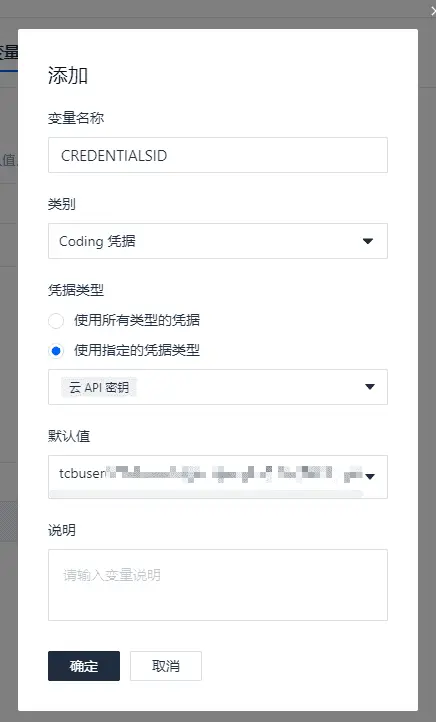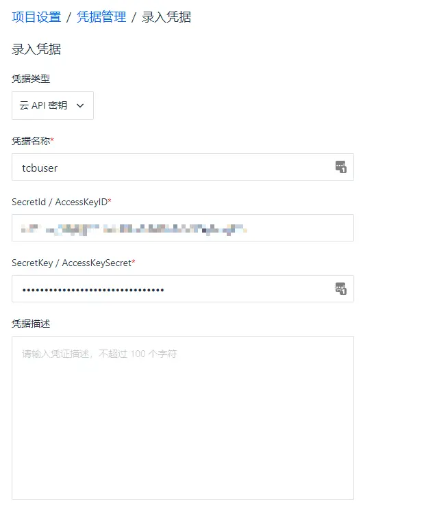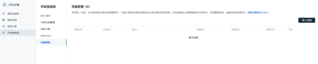 SecretId 和 SecretKey 信息属于敏感信息,我们需要以 CODING 凭据的形式保存在项目配置中,使用凭据后你的敏感信息将不会出现在构建日志和 Jenkinsfile 中,这样会更加安全。进入项目,依次选择项目设置、开发者选项、凭据管理,录入一个凭据。