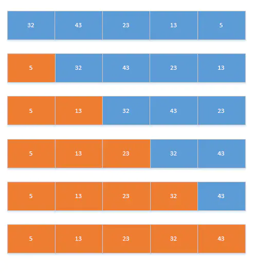 - 比对完成后,将最小的值与第一个数的值交换。