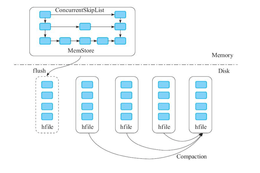Mysql基于通过B+树实现了聚簇索引,读性能较高,但写性能较差。HBase在缓存被击穿后,为了保证读性能,HFile KV数据的K必须有序排列,如果在写到HFile时再排序,将会是磁盘随机写,写性能会很差。为了同时兼顾读写性能,HBase基于LSM来设计存储模型。如上图,MemStore采用跳跃表(java中对应ConcurrentSkipListMap)来作为底层实现,在MemStore的数据 flush到HFile之前,会对MemStore中的数据先进性排序。这样原本一次磁盘的随机写入就转换成了内存随机写和磁盘顺序写。