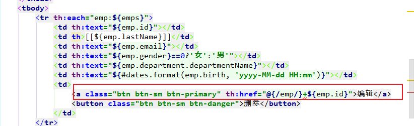 <button th:attr="del_uri=@{/emp/}+${emp.id}" class="btn btn-sm btn-danger deleteBtn">删除</button>