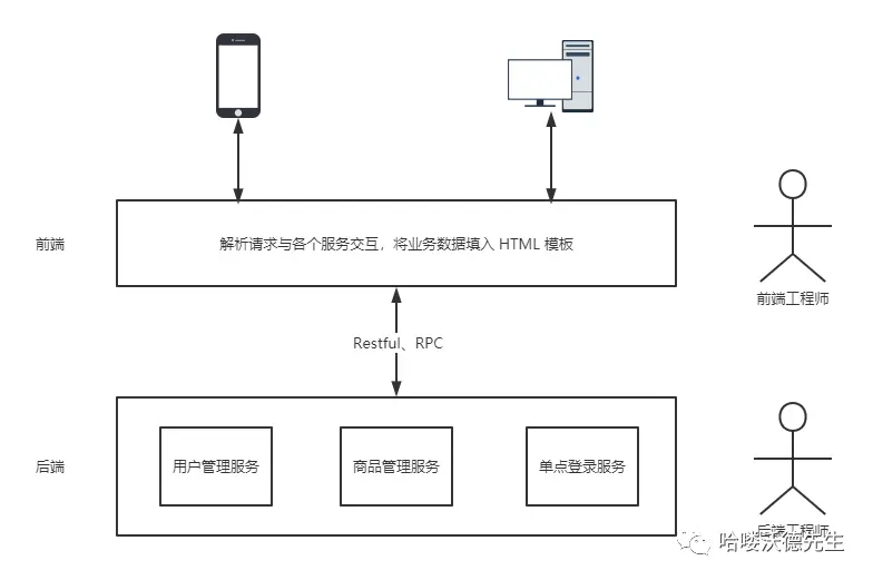 这种应用模式比较适合纯网页应用,但是当后端对接 App 时,App 可能并不需要后端返回一个 HTML 网页,而仅仅是数据本身,所以后端原本返回网页的接口不再适用于前端 App 应用,为了对接 App 后端还需再开发一套接口。