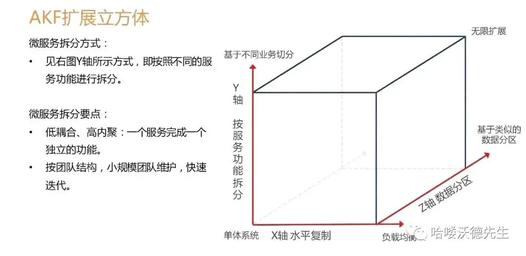 一个叫 AKF 的公司的技术专家抽象总结的应用扩展的三个维度。理论上按照这三个扩展模式,可以将一个单体系统,进行无限扩展。