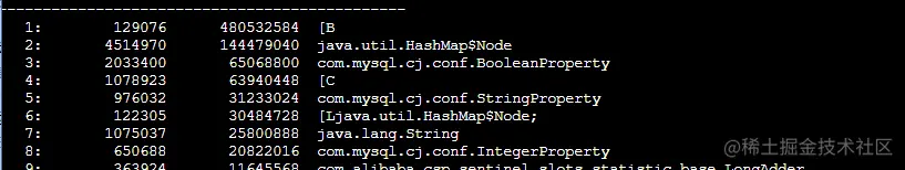 先简单在线上观察了一波,排第2的HashMap$Node看起来比较异常,但是看不出更详细的情况了。最好的办法还是将内存快照dump出来,使用MAT分析一波
