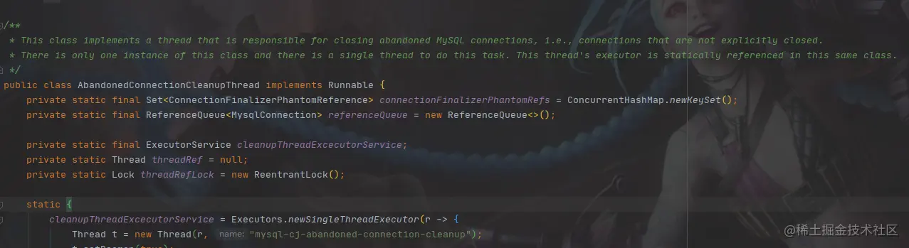 这个类占用了80%以上的内存,那么这个类是干嘛的呢? 看类名就知道,应该是MySQL Driver中用来清理过期连接的一个线程。让我们看一下源码: