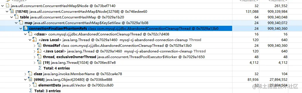 果然没错,罪魁祸首找到了! 那么它里面存的是啥东西呢? 为什么一直增长且无法被YoungGC回收?看名字ConnectionFinalizerPhantomReference 我们可以猜到它里面保存的应该是数据库连接的phantom引用