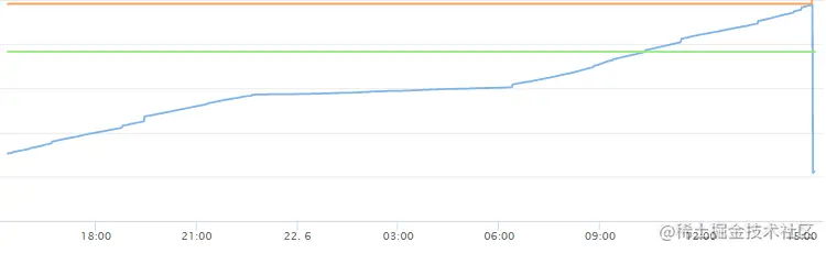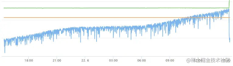 排除了DB的影响之后,再往上排查容器的影响 我们再次回过头看异常告警,发现在每一波告警的时间段内,基本上都是同一个容器IP所产生,这个时候基本上已经有80%的概率是GC的问题了。 查询告警时间段内的容器CPU负载正常。再看JVM的内存和GC情况,发现整个内存使用曲线是像下面这样: