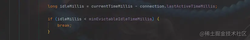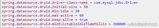 可以看到是设置了keepAlive,且minEvictableIdleTimeMillis设置的是5分钟,连接初始化之后,在DB请求数没有频繁的波动时,连接池应该都是维护着最小的30个连接,且会在连接空闲时间超过5分钟时进行一次keepAlive操作:
