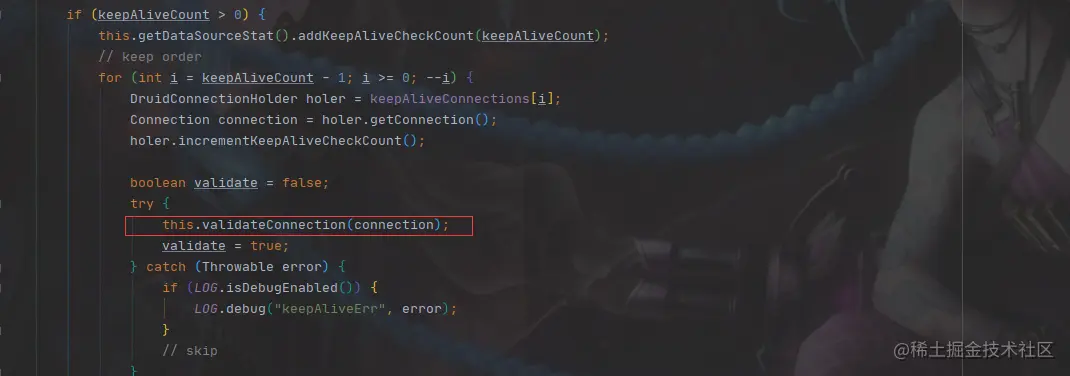 - 空闲连接依赖于Druid的keepAlive定时任务来进行心跳检测和keepAlive,定时任务默认每60秒检测一次,并且只有当连接的空闲时间大于minEvictableIdleTimeMillis时才会进行心跳检测。