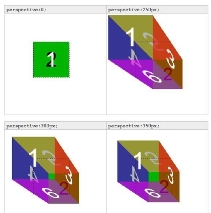 程序中实现的方法 perspective 元素距离 视线的距离(物体和眼睛的距离越小,近大远小的效果越明显)